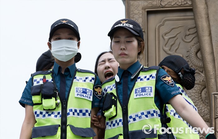 (서울=포커스뉴스) 12일 오전 서울 종로구 광화문광장 세종대왕 동상에서 알바연대알바노조가 최저임금 1만원 인상을 요구하며 기습시위를 벌이고 있다.