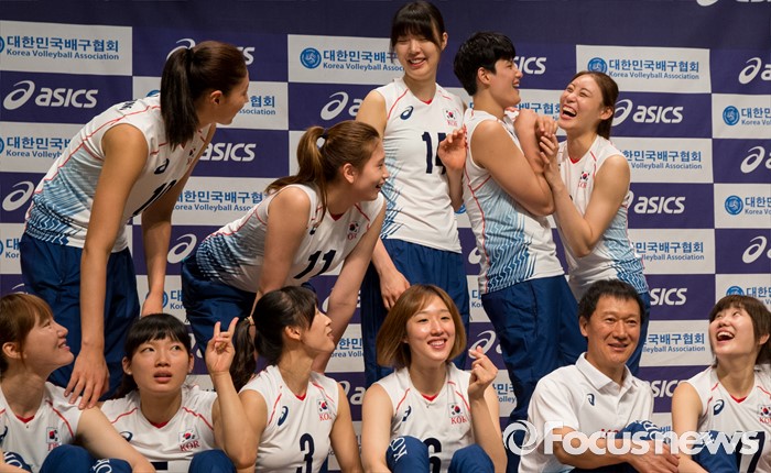 (진천=포커스뉴스) 12일 오전 충북 진천 선수촌 대강당에서 열린 '대한민국 여자배구 국가대표선수단 기자회견'에 참석한선수들이 포즈를 취하고 있다. 이날 기자회견을 가진 여자배구 선수단은 리우올림픽을 대비해 23일 네덜란드로 전지훈련을 떠날 계획이다.