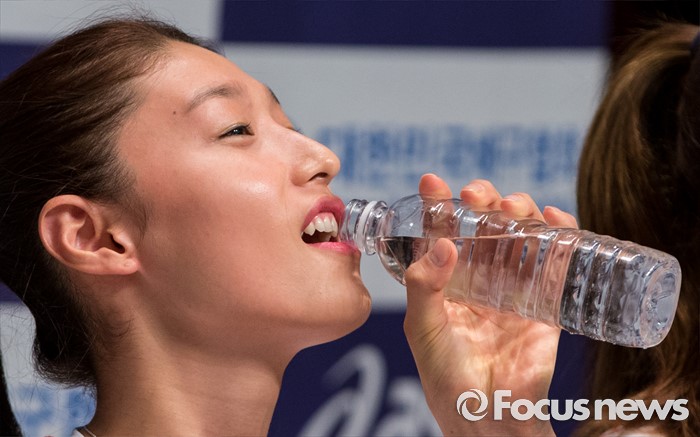 (진천=포커스뉴스) 12일 오전 충북 진천 선수촌 대강당에서 열린 '대한민국 여자배구 국가대표선수단 기자회견'에 참석한 김연경 선수가 물을 마시고 있다. 이날 기자회견을 가진 여자배구 선수단은 리우올림픽을 대비해 23일 네덜란드로 전지훈련을 떠날 계획이다.