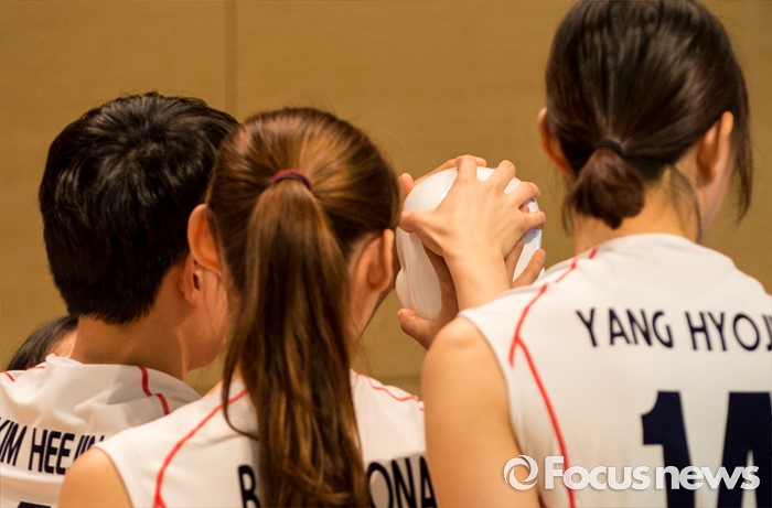 (진천=포커스뉴스) 12일 오전 충북 진천 선수촌 대강당에서 열린 '대한민국 여자배구 국가대표선수단 기자회견'에 참석한 선수들이 마네킹으로 장난을 치고 있다. 이날 기자회견을 가진 여자배구 선수단은 리우올림픽을 대비해 23일 네덜란드로 전지훈련을 떠날 계획이다.