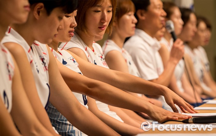 (진천=포커스뉴스) 12일 오전 충북 진천 선수촌 대강당에서 열린 '대한민국 여자배구 국가대표선수단 기자회견'에 참석한 선수들이 대화하고 있다. 이날 기자회견을 가진 여자배구 선수단은 리우올림픽을 대비해 23일 네덜란드로 전지훈련을 떠날 계획이다.
