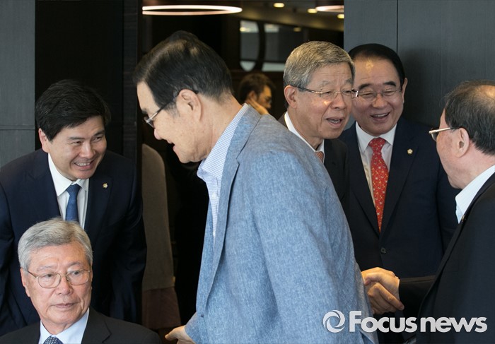 (서울=포커스뉴스) 김희옥 새누리당 혁신비대위원장이 12일 오후 서울 여의도 한 중식당에서 열린 상임고문단 만찬에 참석해 참석자들과 인사하고 있다.