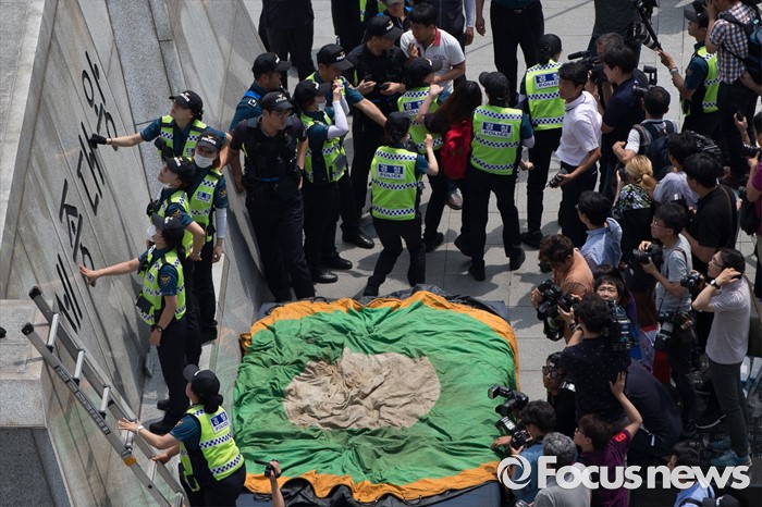 (서울=포커스뉴스) 12일 오전 서울 종로구 광화문광장 세종대왕 동상에서 알바연대알바노조가 최저임금 1만원 인상을 요구하며 기습시위를 벌이던 중 경찰들에게 제지당하고 있다.