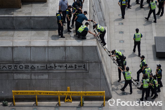 (서울=포커스뉴스) 12일 오전 서울 종로구 광화문광장 세종대왕 동상에서 경찰들이 알바연대알바노조의 최저임금 1만원 인상을 요구하며 기습시위를 제지하고 철수하고 있다.