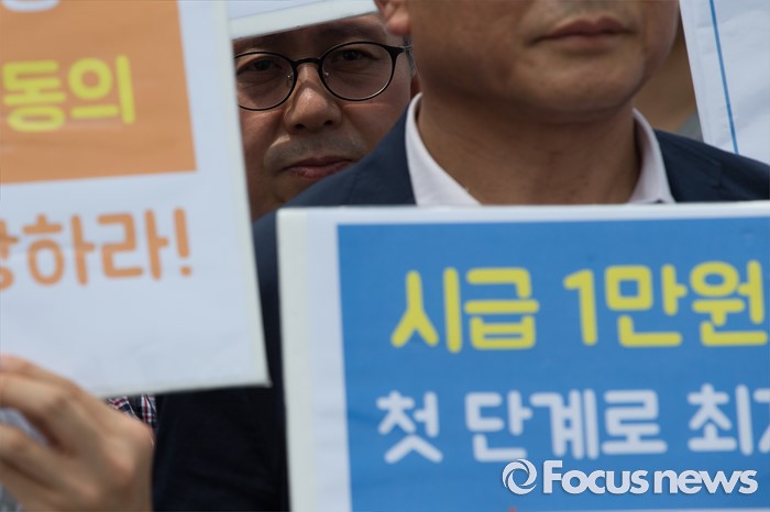(서울=포커스뉴스) 경제정의실천시민연합 회원들이 12일 오후 서울 종로구 정부서울청사 앞에서 최저임금 인상 촉구 합동 기자회견을 하고 있다.