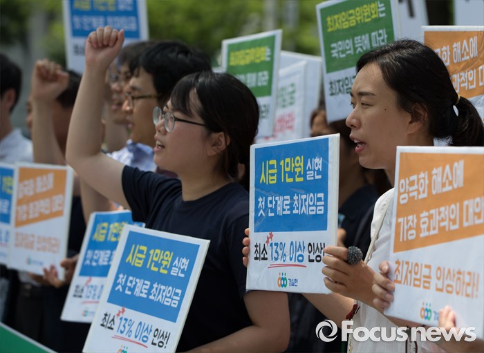 (서울=포커스뉴스) 경제정의실천시민연합 회원들이 12일 오후 서울 종로구 정부서울청사 앞에서 최저임금 인상 촉구 합동 기자회견을 하고 있다.