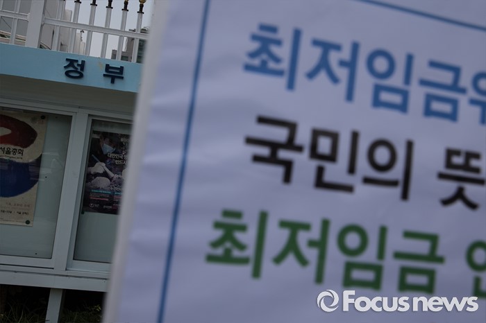(서울=포커스뉴스) 경제정의실천시민연합 회원들이 12일 오후 서울 종로구 정부서울청사 앞에서 최저임금 인상 촉구 합동 기자회견을 하고 있다.