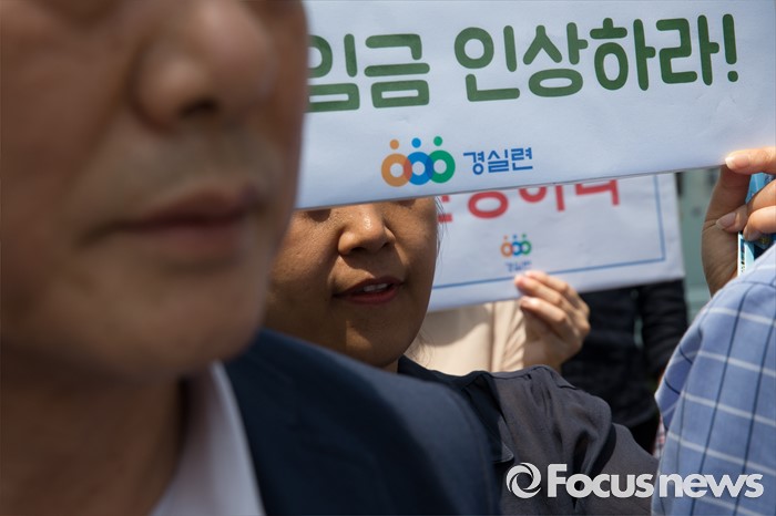 (서울=포커스뉴스) 경제정의실천시민연합 회원들이 12일 오후 서울 종로구 정부서울청사 앞에서 최저임금 인상 촉구 합동 기자회견을 하고 있다.