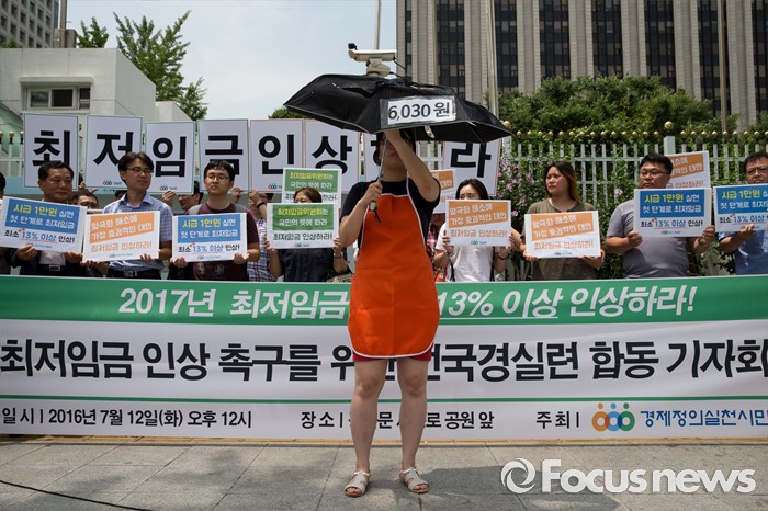 (서울=포커스뉴스) 경제정의실천시민연합 회원들이 12일 오후 서울 종로구 정부서울청사 앞에서 최저임금 인상 촉구 합동 기자회견을 하고 있다.