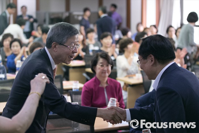(서울=포커스뉴스) 김희옥(왼쪽) 새누리당 혁신비대위원장이 12일 오후 서울 여의도 중소기업중앙회에서 열린 2016 양성평등 포럼에 참석해 전당대회 출마를 선언한 이주영 의원이 인사를 하고 있다.