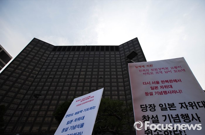 (서울=포컷뉴스) 12일 오후 서울 중구 밀레니엄서울힐튼호텔 앞에서 '일본 자위대 62주년 창설 기념식'을 규탄하는 시민단체들의 시위가 열리고 있다.