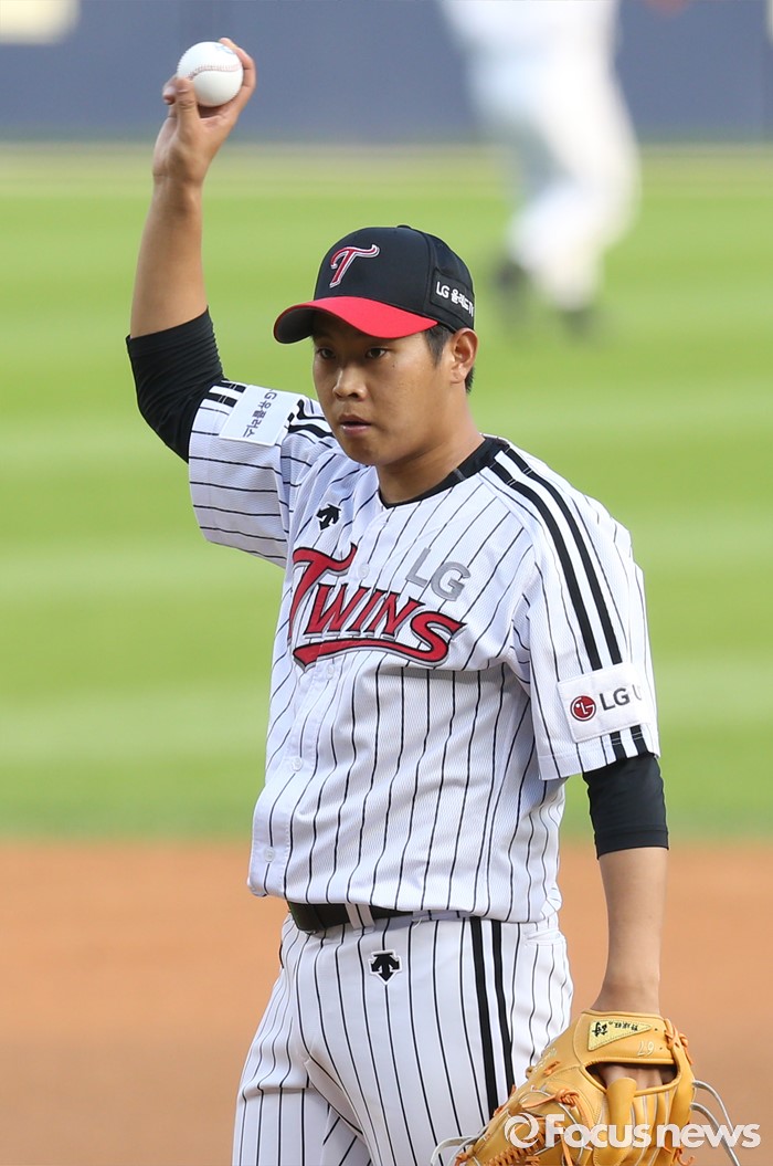 (서울=포커스뉴스) 12일 서울 잠실구장에서 열린 2016 프로야구 한화-LG 경기에서 1회초 LG 선발투수 유경국이 투구전 포수에게 사인을 보내고 있다.