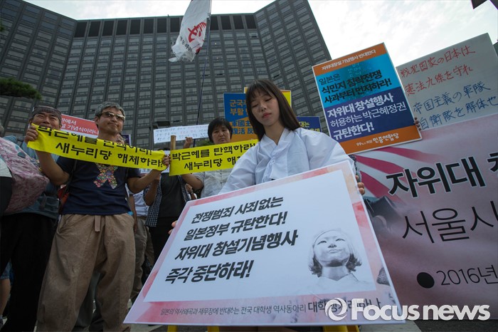 (서울=포컷뉴스) 12일 오후 서울 중구 밀레니엄서울힐튼호텔 앞에서 '일본 자위대 62주년 창설 기념식'을 규탄하는 시민단체들의 시위가 열리고 있다.