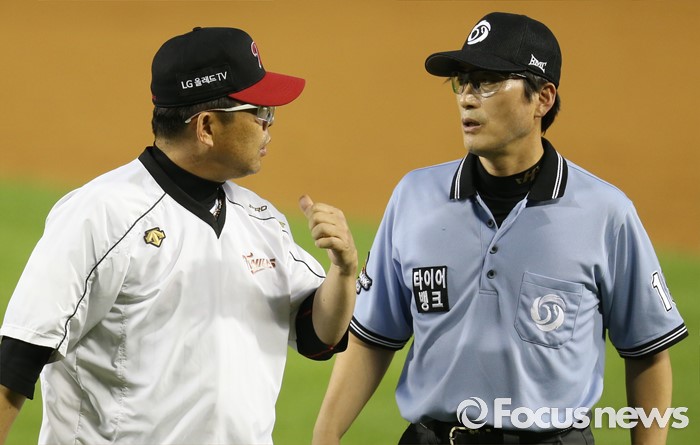 (서울=포커스뉴스) 12일 서울 잠실구장에서 열린 2016 프로야구 한화-LG 경기 4회초 LG 양상문 감독이 강광회 1루심에게 합의판정을 요청하고 있다.