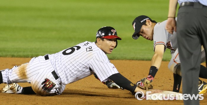 (서울=포커스뉴스) 12일 서울 잠실구장에서 열린 2016 프로야구 한화-LG 경기 7회말 LG 손주인이 중견수 오른쪽에 떨어지는 2루타를 치고 2루에서 오버런했다 세이프되고 있다.