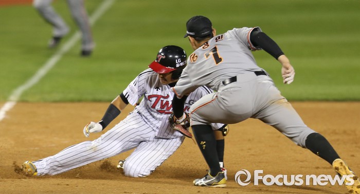 (서울=포커스뉴스) 12일 서울 잠실구장에서 열린 2016 프로야구 한화-LG 경기 7회말 2사 1,2루에서 LG 채은성이 2타점 우중간 3루타를 치고 슬라이딩하며 3루로 들어가고 있다.