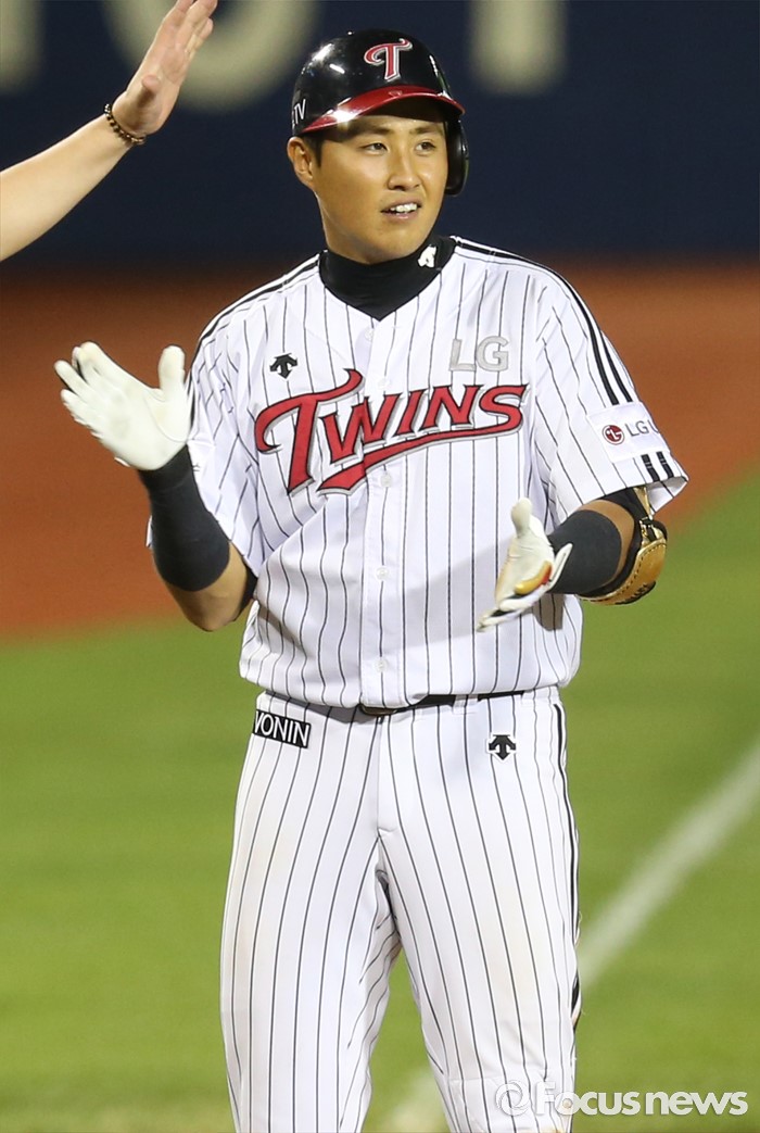 (서울=포커스뉴스) 12일 서울 잠실구장에서 열린 2016 프로야구 한화-LG 경기 7회말 2사 1,2루에서 LG 채은성이 역전 2타점 우중간 3루타를 치고 3루에서 박수치고 있다.