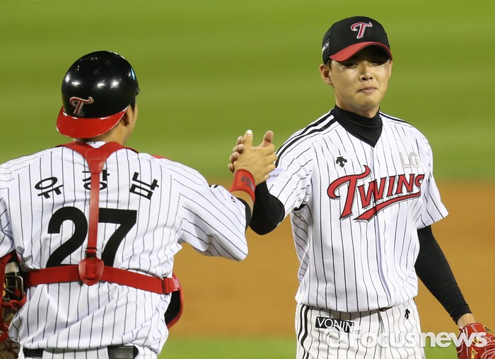(서울=포커스뉴스) 12일 서울 잠실구장에서 열린 2016 프로야구 한화-LG 경기에서 한화에 5-4, 1점차 짜릿한 역전승을 지킨 LG 임정우가 포수 유강남과 하이파이브하며 기뻐하고 있다.