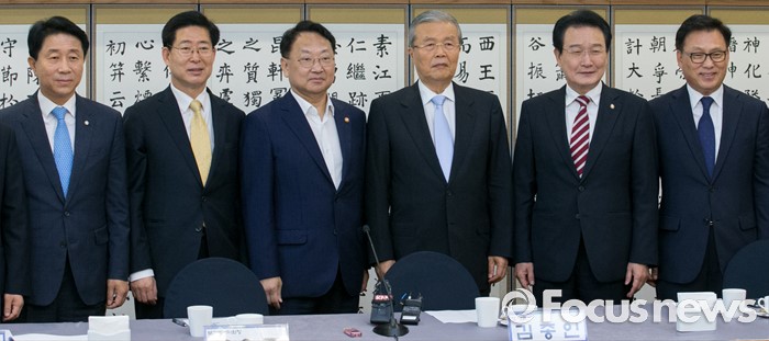 (서울=포커스뉴스) 13일 오전 서울 여의도 국회 귀빈식당에서 열린 더불어민주당 저출산 해소를 위한 국민연금 공공투자 특별위원회 1차 정책협의회에 참석한 김종인 비대위 대표, 유일호 경제부총리 겸 기획재정부 장관과 의원들이 취재진을 향해 포즈를 취하고 있다. 왼쪽부터 조정식 국토교통위원장, 양승조 보건복지위원장, 유 부총리, 김 대표, 변재일 정책위의장, 박광온 특위 위원장.