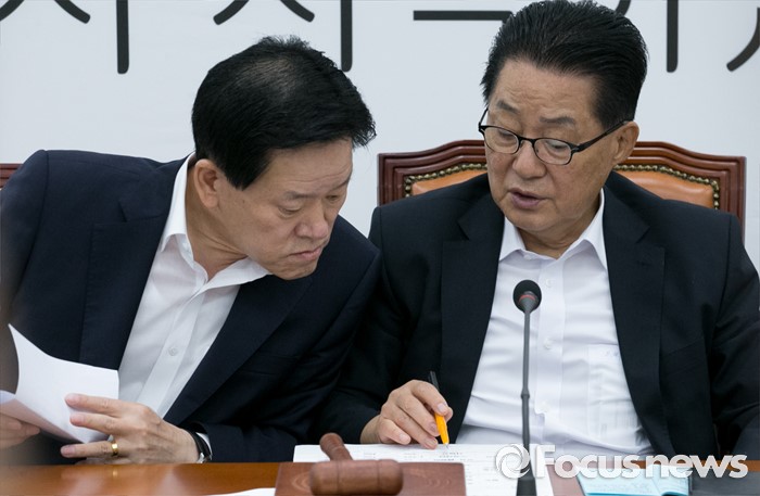 (서울=포커스뉴스) 13일 오전 서울 여의도 국회에서 열린 국민의당 비상대책위원회의에 참석한 박지원(오른쪽) 비대위원장과 주승용 비대위원이 대화하고 있다.
