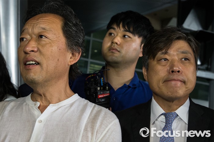 (인천=포커스뉴스) 명예훼손과 항공료 횡령 등 의혹으로 고소·고발된 정명훈(왼쪽) 전 서울시향 감독이 검찰 조사를 앞두고 13일 오전 인천 중구 인천공항을 통해 입국해 취재진의 질문에 답하고 있다.