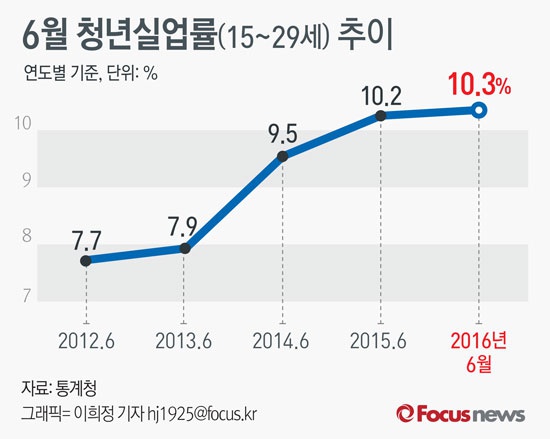 (서울=포커스뉴스) 통계청이 13일 발표한 '6월 고용동향'에 따르면 6월 청년(15∼29세)실업률은 10.3%로 두달만에 두자릿수 실업률을 기록했다. 전체 실업률은 전년동월대비 0.3%p 감소했으나 청년실업률은 6월을 기준으로 할 경우 통계 작성 시작 연도인 1999년 이후 역대 최고치다.