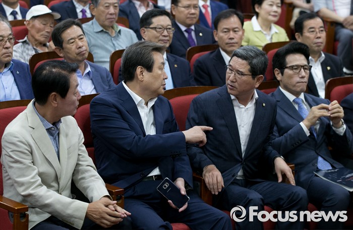 (서울=포커스뉴스) 13일 오전 서울 여의도 국회 의원회관에서 열린 대한민국 미래혁신포럼 창립기념 특강에 참석한 김무성 새누리당 전 대표와 김학용 의원이 대화하고 있다. 왼쪽부터 한선교, 김무성, 김학용, 정병국 의원.