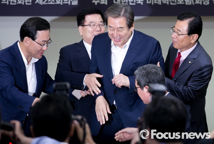 (서울=포커스뉴스) 13일 오전 서울 여의도 국회 의원회관에서 열린 대한민국 미래혁신포럼 창립기념 특강에 참석한 의원들이 기념촬영에 앞서 김무성 새누리당 전 대표가 앞에 설 것을 권하고 있다. 왼쪽부터 주호영 의원, 김광림 정책위의장, 김 전 대표, 이현재 의원.