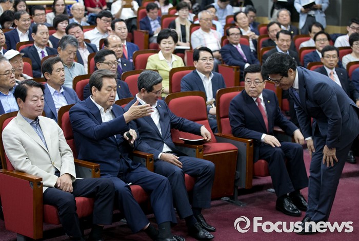 (서울=포커스뉴스) 13일 오전 서울 여의도 국회 의원회관에서 열린 대한민국 미래혁신포럼 창립기념 특강에 참석한 정병국 새누리당 의원이 축사에 앞서 김무성 전 대표 등에게 인사하고 있다.