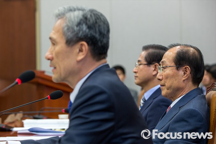 (서울=포커스뉴스) 이원종(가운데) 대통령비서실 비서실장이 13일 오전 서울 여의도 국회에서 열린 '운영위원회 전체회의'에 참석해 사드배치에 관련된 김관진(왼쪽) 국가안보실장의 질의응답을 경청 하고 있다.