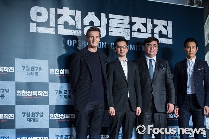 (서울=포커스뉴스) 13일 오전 서울 영등포구 콘래드 서울 호텔에서 열린 영화 '인천상륙작전' 기자간담회에 참석한 배우 리암 니슨(왼쪽부터) 이재한 감독, 정태원 제작사 대표, 이정재가 포토타임을 갖고 있다.