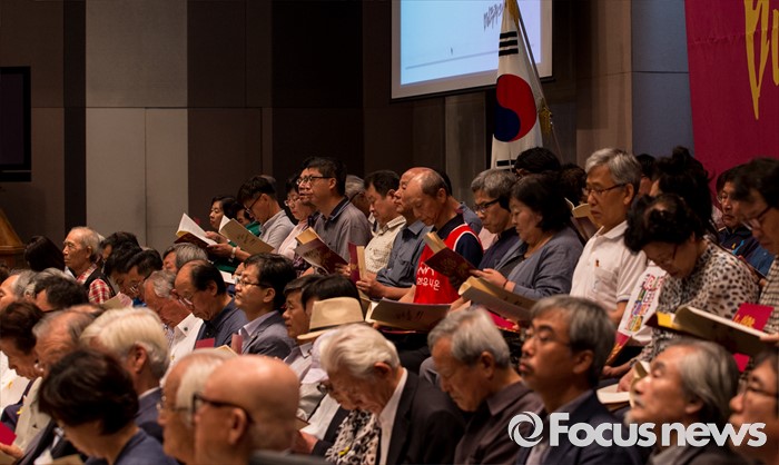 (서울=포커스뉴스) 13일 오전 서울 중구 프레스센터에서 열린 '한상균을 석방하라, 민주주의 살려내자' 7.13 시국회의에 참석한 시국선언인단이 시국선언문을 읽고 있다.
