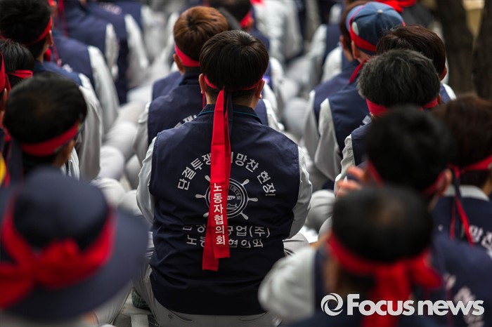 (서울=포커스뉴스) 13일 오전 서울 여의도 산업은행 본점 앞에서 삼성중공업 노동자협의회 관계자들이 고용안정 요구 및 정부의 조선업 구조조정을 규탄하는 상경 집회를 하고 있다.