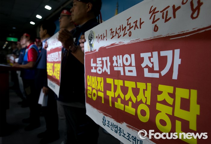 (서울=포커스뉴스) 13일 오전 서울 여의도 국회 정론관에서 조선업종노조연대 등 관계자들이 일방적 구조조정에 반대하는 총파업 선언 기자회견을 하고 있다.