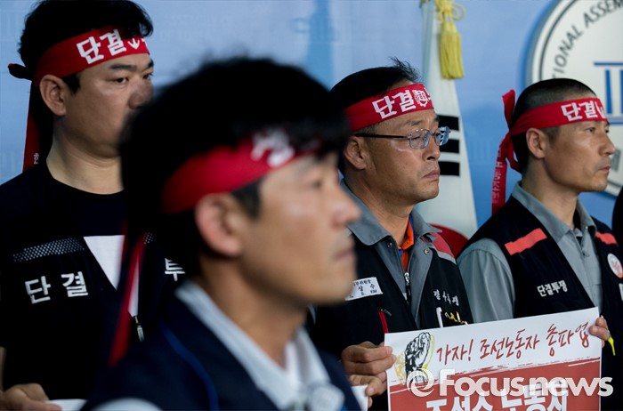 (서울=포커스뉴스) 13일 오전 서울 여의도 국회 정론관에서 조선업종노조연대 등 관계자들이 일방적 구조조정에 반대하는 총파업 선언 기자회견을 하고 있다.