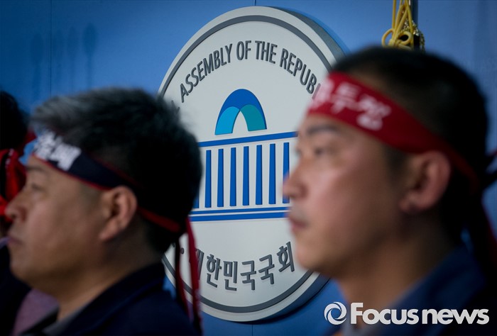 (서울=포커스뉴스) 13일 오전 서울 여의도 국회 정론관에서 조선업종노조연대 등 관계자들이 일방적 구조조정에 반대하는 총파업 선언 기자회견을 하고 있다.