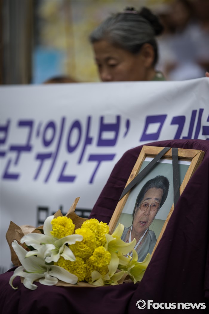 (서울=포커스뉴스) 자위대 창설 62주년 기념행사가 서울 한복판에서 열리고 하루가 지난 13일 오후, 서울 종로구 주한일본대사관 앞에서 일본군 '위안부' 문제 해결을 위한 제1239차 정기 수요집회가 열리고 있다. 지난 10일 세상을 떠난 고 유희남 할머니의 영정사진이 집회 앞 자리에 놓여져 있다.