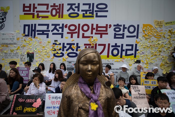 (서울=포커스뉴스) 자위대 창설 62주년 기념행사가 서울 한복판에서 열리고 하루가 지난 13일 오후, 서울 종로구 주한일본대사관 앞에서 일본군 '위안부' 문제 해결을 위한 제1239차 정기 수요집회가 열리고 있다.