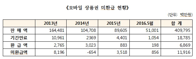 최근 스마트폰 도입 이후 모바일 상품권 시장이 급성장해 2013년부터 올해 5월까지 4100억원 가량의 모바일 상품권이 판매됐다. 같은 기간 동안 기간만료 된 모바일 상품권은 187억원이었으며, 미환급 금액은 119억원에 달했다.