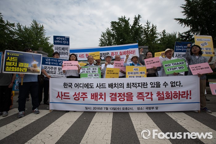 (서울=포커스뉴스) 국방부에서 주한미군 고고도 미사일 방어 체계 사드(THAAD) 배치 지역을 성주로 결정하고 공식 발표를 앞둔 13일 오후, 평통사 관계자 및 시민들이 서울 용산구 국방부 앞에서 정부를 규탄하는 시위를 하고 있다.