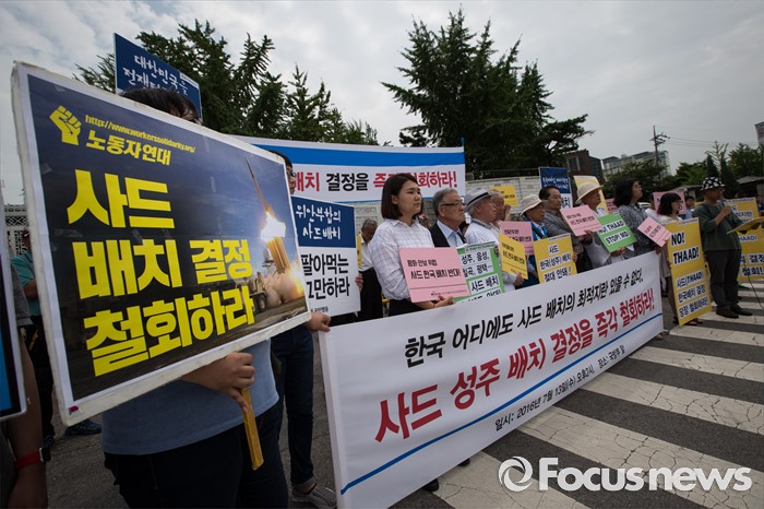 (서울=포커스뉴스) 국방부에서 주한미군 고고도 미사일 방어 체계 사드(THAAD) 배치 지역을 성주로 결정하고 공식 발표를 앞둔 13일 오후, 평통사 관계자 및 시민들이 서울 용산구 국방부 앞에서 정부를 규탄하는 시위를 하고 있다.