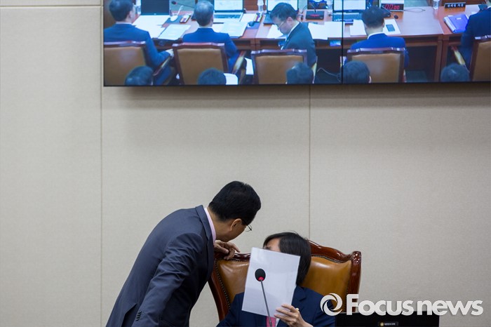(서울=포커스뉴스) 국회 기획재정위원회 위원장인 조경태(오른쪽) 새누리당 의원과 새누리당 간사 이현재 의원이 13일 오후 서울 여의도 국회에서 열린 '기획재정위원회 전체회의'에 참석해 대화 하고 있다.