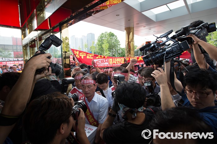 (서울=포커스뉴스) 13일 오후 서울 용산구 국방부를 찾은 성주 군수와 군민들이 사드배치 반대 성명서를 전달하기 위해 국방컨벤션을 들어서고 있다. 이날 국방부에서 주한미군 고고도 미사일 방어 체계 사드(THAAD) 배치 지역을 성주로 결정하고 공식 발표했다.