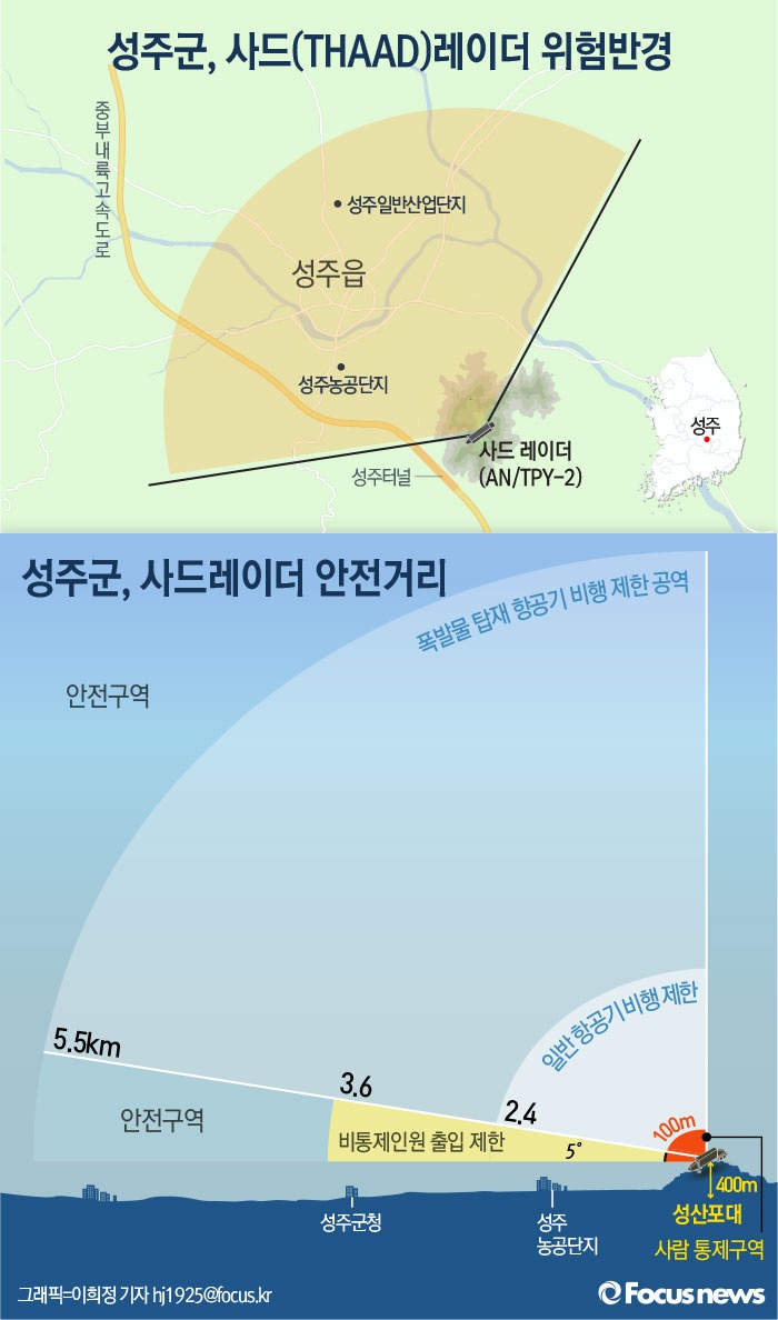 (서울=포커스뉴스) 13일 국방부는 주한미군 사드(THAAD·고고도 미사일방어체계) 배치지역을 경상북도 성주로 결정했다고 공식 발표했다. 사드레이더의 위험반경과 안전거리에 대해 알아봤다.