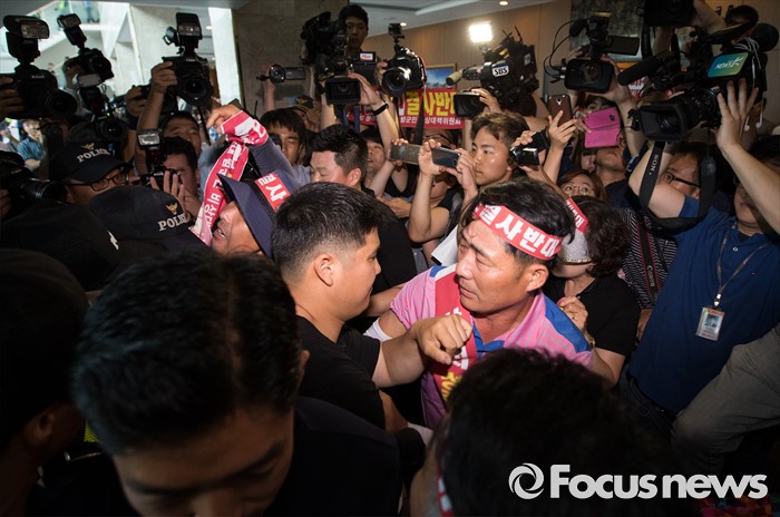 (서울=포커스뉴스) 국방부가 사드 배치 지역을 경북 성주로 확정 지은 13일 오후 서울 용산구 국방컨벤션에서 성주군민들이 군수와 국방부 관계자 면담자리에 진입을 시도하고 있다.