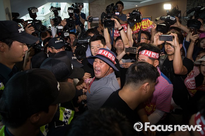 (서울=포커스뉴스) 국방부가 사드 배치 지역을 경북 성주로 확정 지은 13일 오후 서울 용산구 국방컨벤션에서 성주군민들이 군수와 국방부 관계자 면담자리에 진입을 시도하고 있다.