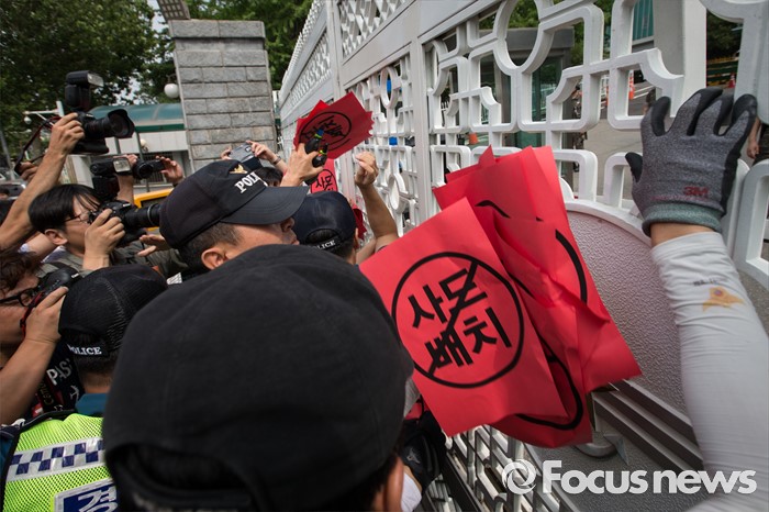 (서울=포커스뉴스) 경찰들이 13일 오후 서울 용산구 국방부 정문 앞에서 평통사(평화와 통일을 여는 사람들) 관계자들과 시민들이 붙여 놓은 사드 배치 반대 스티커를 떼어내고 있다. 이날 국방부는 주한미군 고고도 미사일 방어 체계 사드(THAAD) 배치 지역을 성주로 결정, 발표 했다.