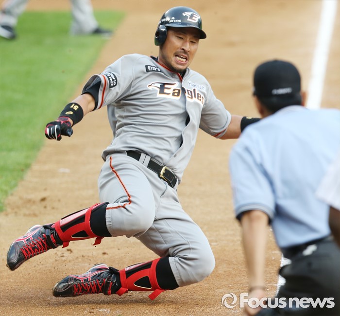 (서울=포커스뉴스) 13일 서울 잠실구장에서 열린 2016 프로야구 한화-LG 경기 1회초 2사 2,3루에서 한화 김경언이 중견수앞 3루타를 치고 3루를 지나 홈에서 슬라이딩하고 있다.