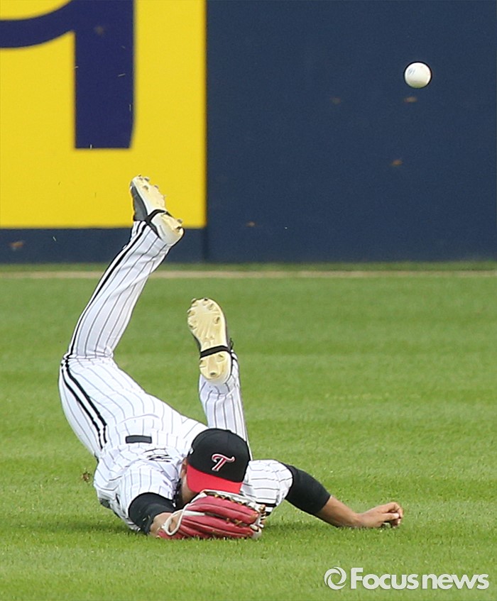 (서울=포커스뉴스) 13일 서울 잠실구장에서 열린 2016 프로야구 한화-LG 경기 1회초 2사 2,3루에서 LG 중견수 이천웅이 한화 김경언의 중전 안타를 다이빙하며 잡으려다 빠트리고 있다.