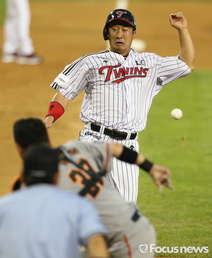 (서울=포커스뉴스) 13일 서울 잠실구장에서 열린 2016 프로야구 한화-LG 경기 4회말 1사 만루에서 LG 3루주자 이병규가 정주현의 좌익수 희생플라이때 홈으로 뛰어들어 세이프되고 있다.